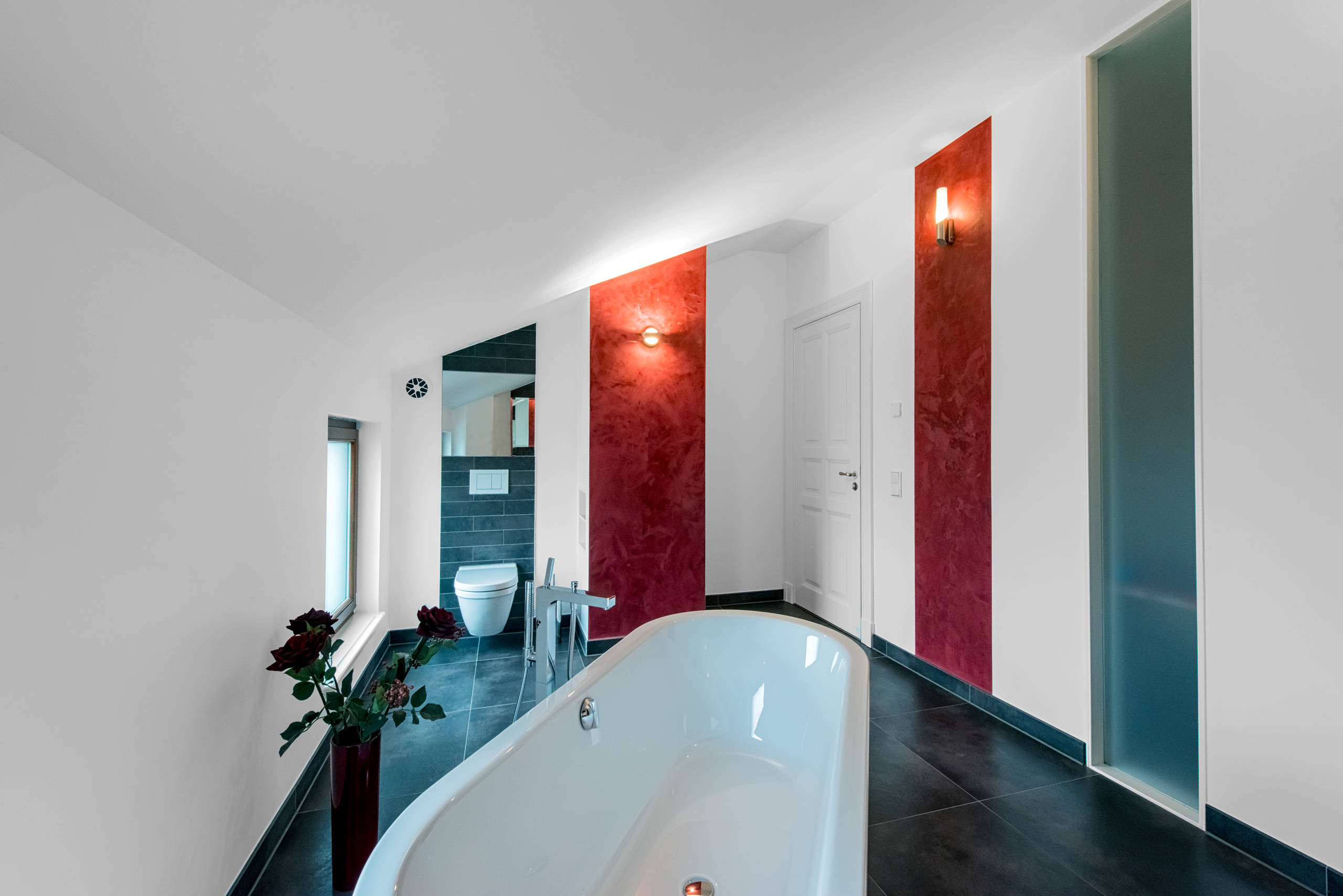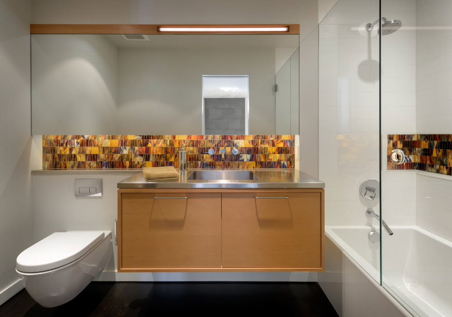 Ưu điểm chính của việc kết hợp phòng tắm và nhà vệ sinh là tăng diện tích có thể sử dụng, đạt được bằng cách phá hủy bức tường và loại bỏ các ô cửa
