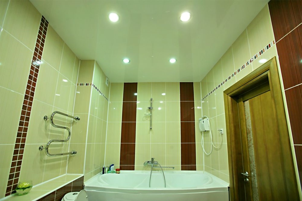 Trần thậm chí đơn giản với đèn sân khấu trong phòng tắm phong cách hiện đại