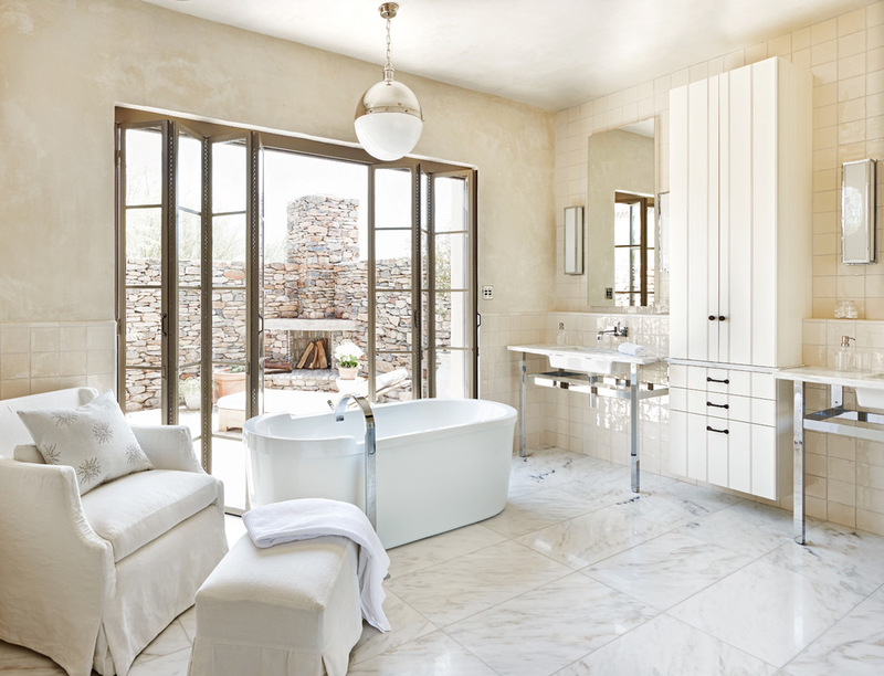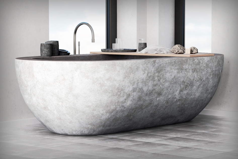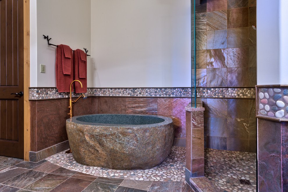 Một bồn tắm với bề mặt bên ngoài gồ ghề sẽ phù hợp với kết thúc bằng đá tự nhiên.