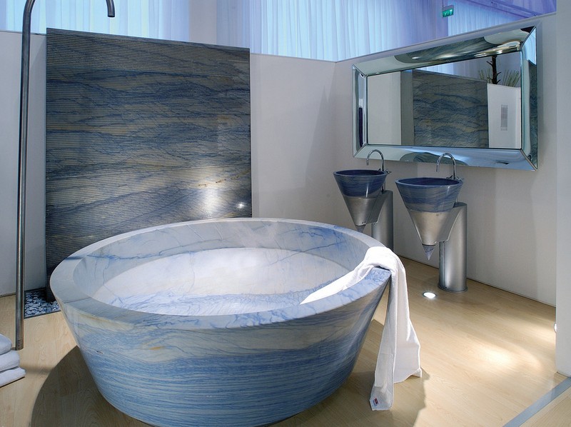 Bồn tắm làm bằng vật liệu này là sang trọng. Tự nhiên - là đắt tiền. Để giảm chi phí thiết kế, có một chất tương tự nhân tạo không thua kém nhiều so với tự nhiên.